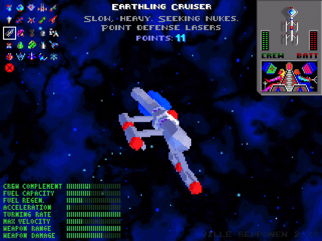Mar 5 2025 - The Earthling Cruiser from Star Control 2 has always been one of my favorites, thanks to its unmistakably Trekkie design. So, I put together a quick low-poly version that looks like it came straight from early '90s gaming hardware. This animation came from a simple curiosity—I wanted to see what the ship might have looked like if Star Control had been released somewhere around 1993-1996, back when games and first-generation 3D consoles rendered surfaces flat, without textures or filtering. I also ended up tweaking the GUI a bit so the ship could have more room to "breathe." Except for the background, the 2D elements were cut, pasted, and modified from an original in-game screenshot. The animation was made in Blender 3D, with additional edits done in Photoshop.