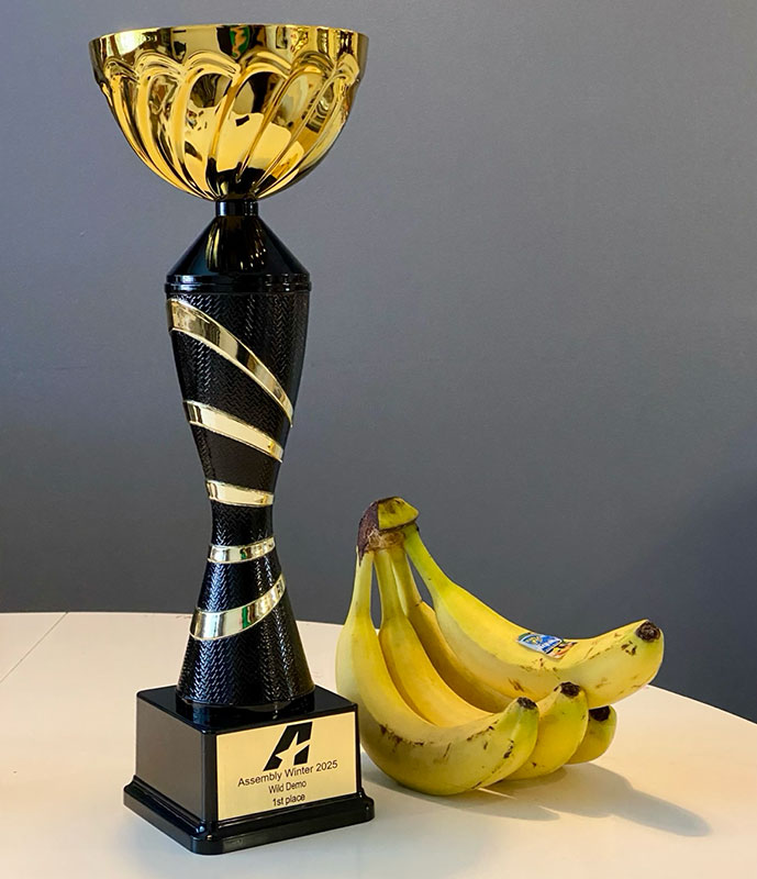 Feb 23 2025 - I’m thrilled to share that my artwork "Cmdr. Duck vs. Octopus" took 1st place in the Wild Demo category at Assembly Winter 2025! Assembly brings together some of the most talented digital artists in the demoscene, and standing on stage to briefly talk about my creative process was an incredible experience. I focused on dynamic composition, material work, humor, storytelling, and it was amazing to see it resonate with the audience who voted for it. Of course, I had to include regular-sized bananas for scale to understand the size of the absolutely massive trophy I got.