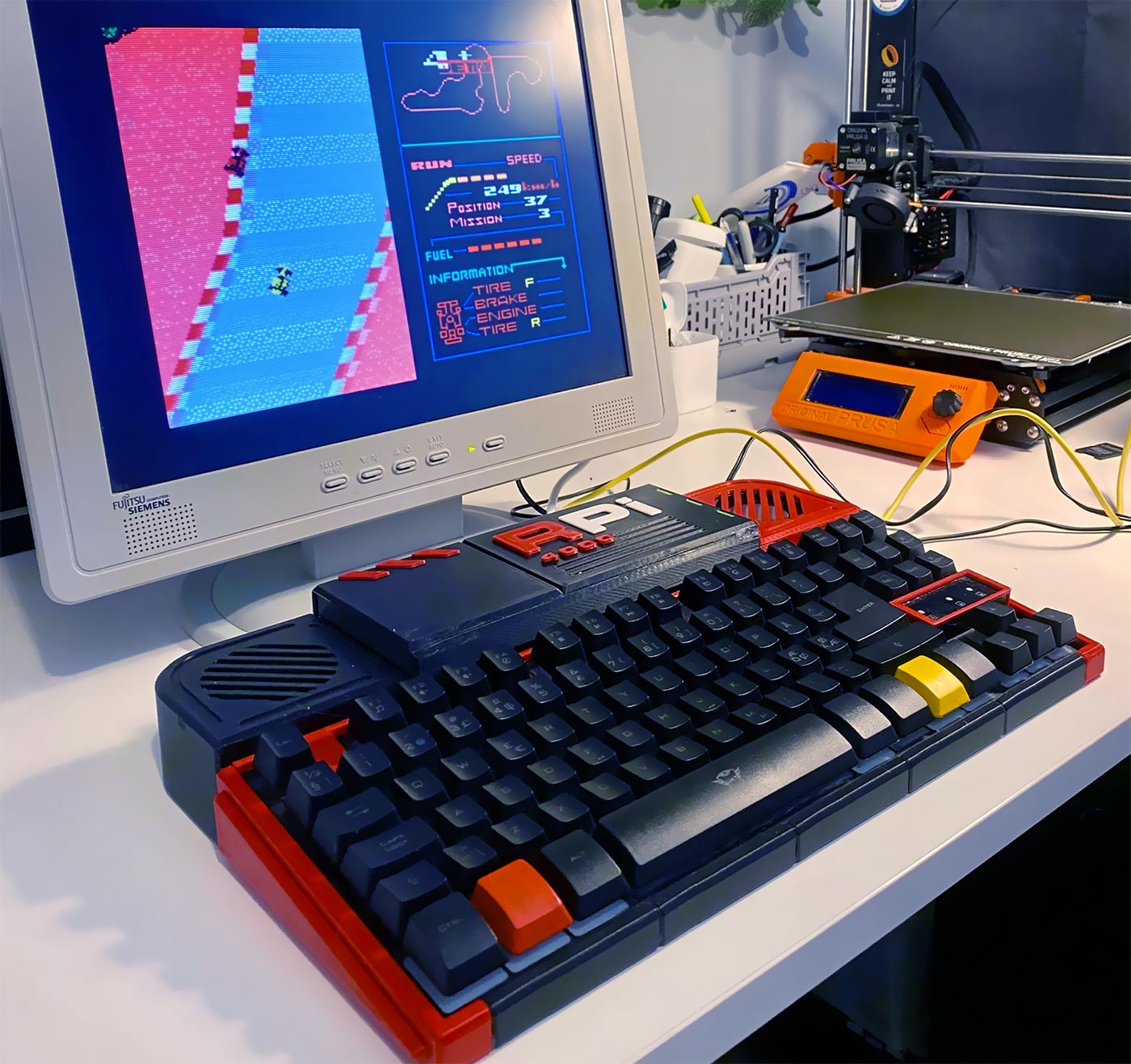Mar 5 2025 - I designed and built a wedge-style computer. It houses a Raspberry Pi 4, active stereo speakers, an SSD drive for storage and a "tenkeyless" keyboard. I used Blender 3D for modeling the 3D parts that I printed using my Prusa of which there are approximately 50 glued together. I drew inspiration from stylish Sony MSX2 computers of the '80s. I'm still going to work on this for a little bit more, but it is already being used for some retro gaming. The game F-1 Spirit from 1987 is running in demo (or "attract" mode) on the screen. Some modest overclocking of the RPi was required to reduce stuttering, but thankfully a hefty heatsink and dual fans keep the temperature in check. While there is no substitute for original 40-year-old hardware, it does deliver some nostalgic feelings, at least for me.