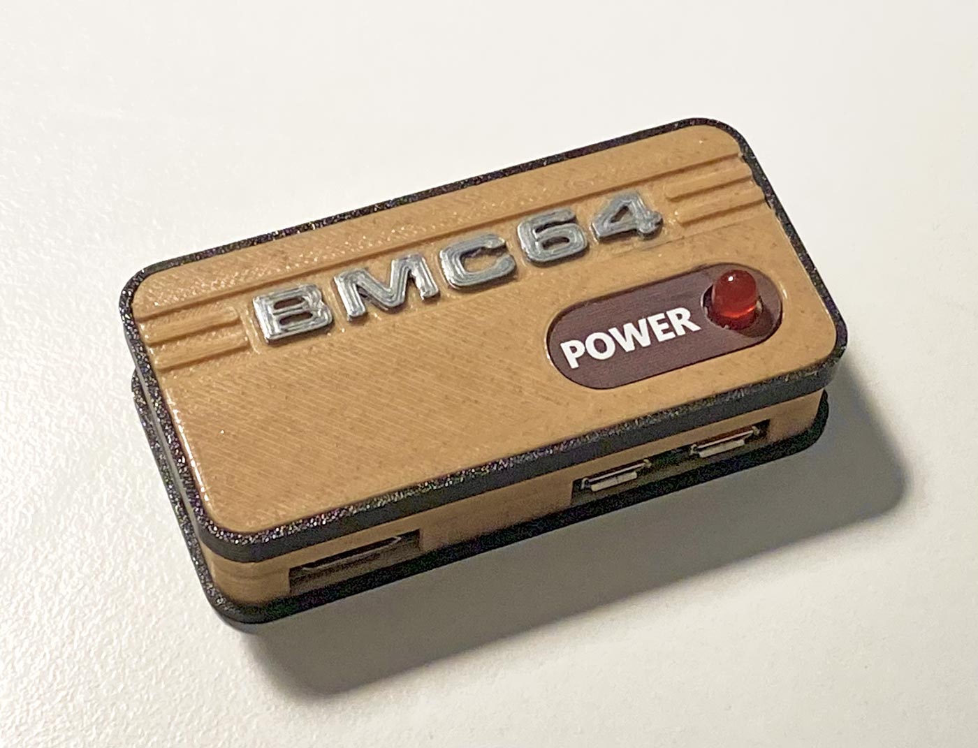 Apr 2 2025 - I designed and 3D printed a case for the original Raspberry Pi Zero to run the BMC64 bare metal Commodore 64 emulator. The brown material is "mukha" PLA. I had a reproduction "power" badge I bought from a seller on Etsy laying around, so I decided to make it a part of this project. The red LED lights up when the power is on, just like the real thing! The dimensions are approx. 7 x 3.5 x 1.6 cm.
