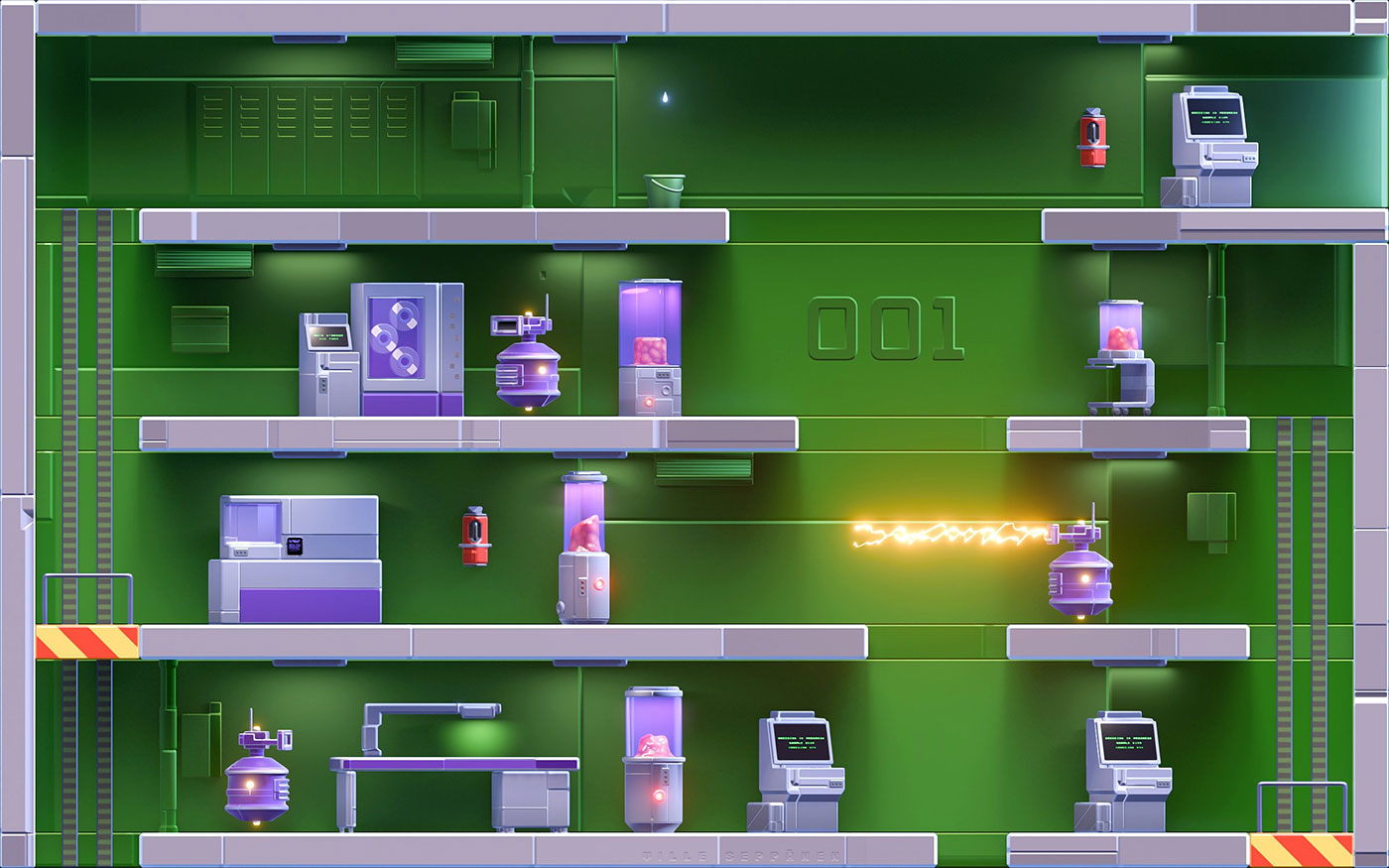 Feb 11 2025 - Who wouldn't remember the old classic Impossible Mission from 1984? I got inspired and decided to make my own version of it with a modern twist. I took some cues for colors from another classic game Wing Commander and also added some storytelling elements, such as biological "breeding" tubes, which aim to add more depth to the original game story wise. Additionally, the fire extinguishers could be used as game mechanical devices, which the player could use to incapacitate or distract the robots. I used Blender 3D and Photoshop.