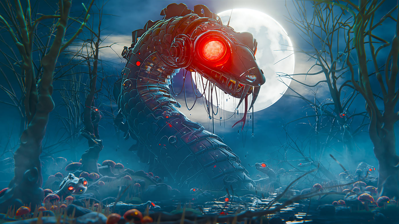 The event's theme, “Fables for Robots”, inspired me to build a dark yet poetic scene: a biomechanical mother snake in her swamp, surrounded by hatchlings. It's a picture about protection and tenderness on the inside, and menace to all who draw too close. Being chosen to close the competition show and then taking the audience's top vote was a moment of both recognition and validation.