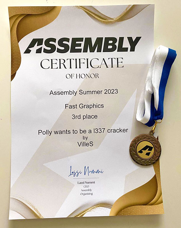 Aug 6 2023 - I received an award for placing third in the fast graphics competition at Assembly Summer 2023, a huge LAN/Demoparty held annually in Helsinki Finland. A prompt of “It was working when you bought it” and 1,5h of time was given to create a picture.