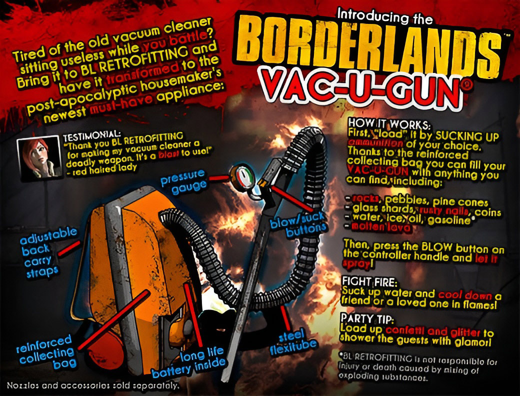 Nov 10 2009 - I designed and created an image of an original weapon for a competition held by V2.fi and the published of Borderlands. It is a vacuum cleaner that can take elements from the environment and use them in creative as ammunition and other non-lethal ways. In addition to the vacuuming, it can also blow whatever material is stored (and mixed) inside.