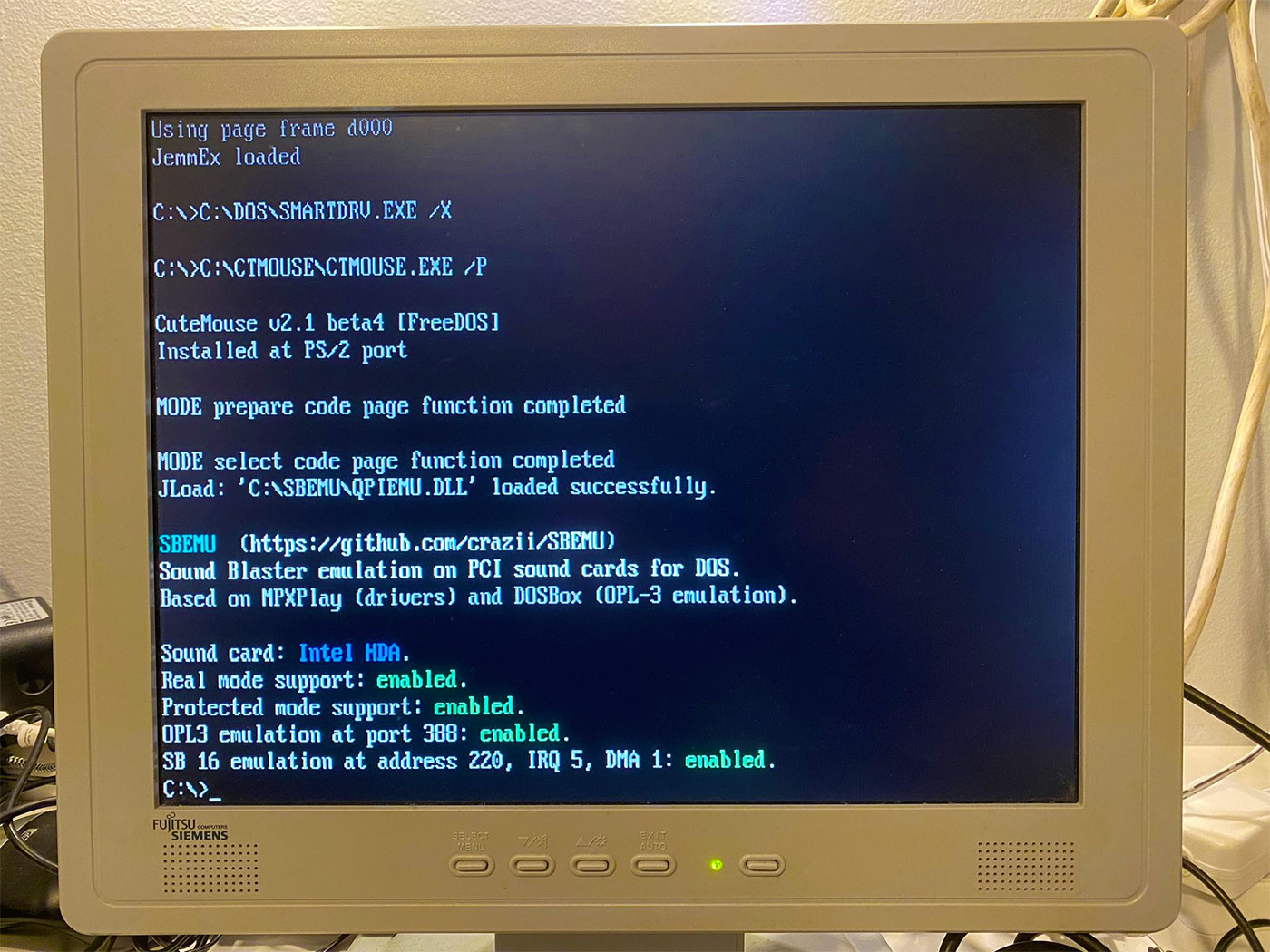 Since it has USB ports, transferring files to it easy by booting into FreeDOS. Cutemouse driver works nicely with a PS/2 mouse and the lack of a natively compatible sound card is remedied by SBEMU Sound Blaster emulation.
